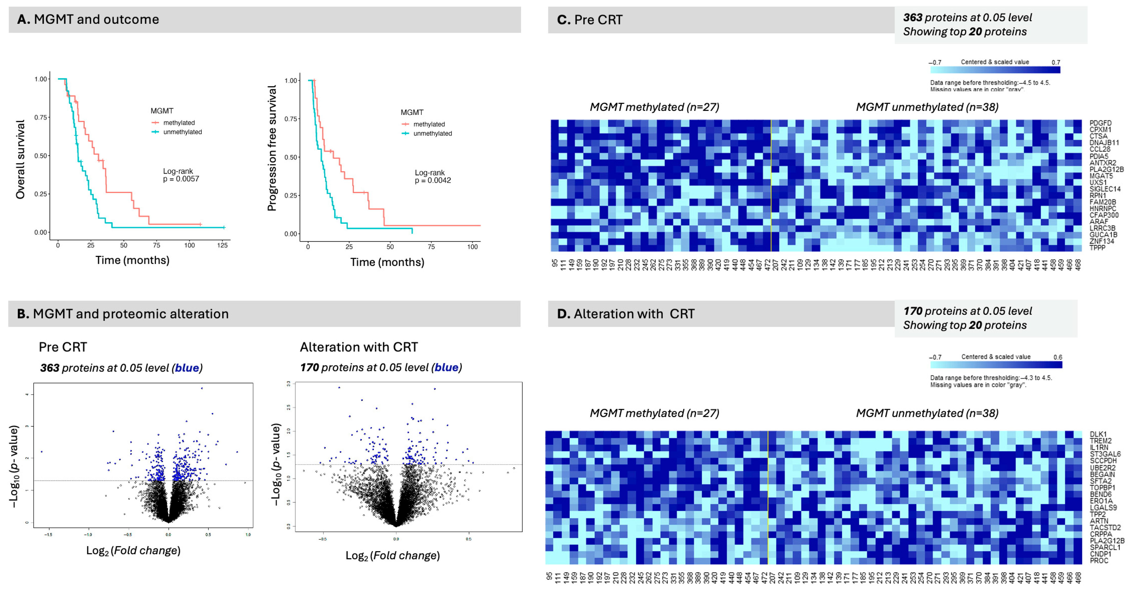 21]. In this study, we aimed to examine how differential alteration in proteomic and metabolomic expression pre- vs. post-completion of concurrent chemoirradiation (CRT) is associated with OS and PFS and molecular classification in GB.