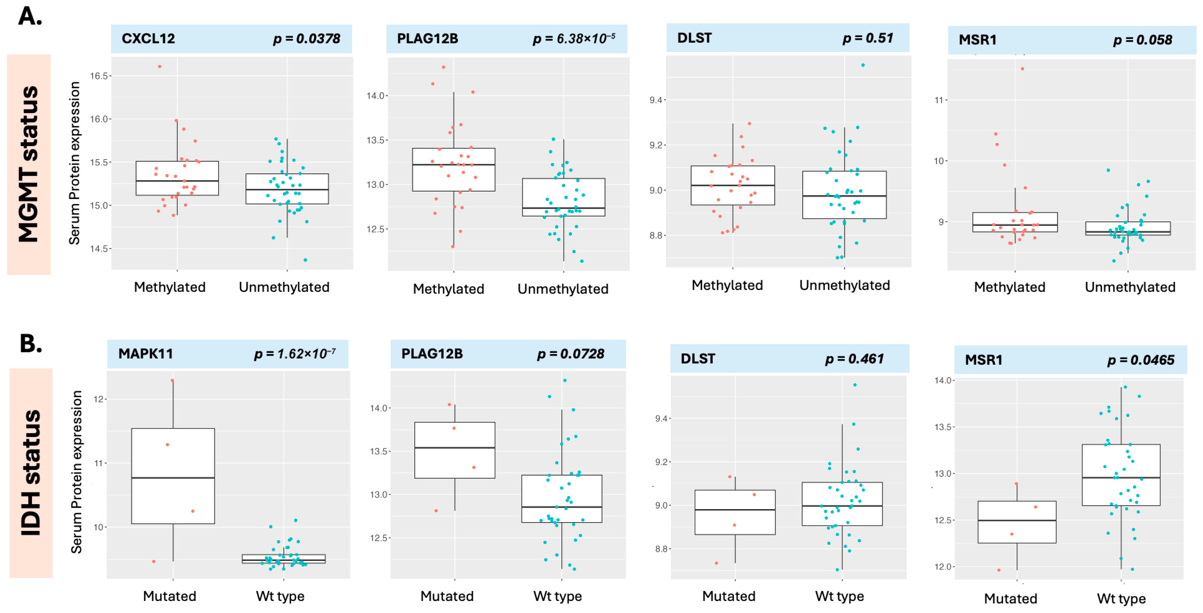 Figure 9). We were unable to validate this finding using CPTAC tissue proteome data or TCGA genomic data. DLST was, however, significantly elevated in the serum of patients with GB compared with healthy individuals. Similarly, an increased MSR1 level emerged in baseline OS, PFS, and in its alteration with OS in the regression analysis and although it did not meet FDR threshold for significance, it was associated with OS in the survival analysis. MSR1 is an interesting molecule as we also noted that it has similar directionality in the CPTAC tissue proteome data, but not in the TCGA genomic data. MSR1 was, however, not significantly different in the serum of patients with GB as compared with healthy individuals. MSR1 (Macrophage Scavenger Receptor-A, aka CD204), has been found elevated in GB as compared to other cancers; its expression is associated with glioma progression [