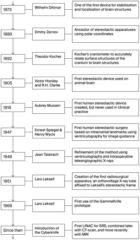 M.G. and D.T. conceptualized the review topic, led the literature search, and drafted the initial manuscript. M.L. and G.L.M. contributed to the historical analysis and critically revised the manuscript for intellectual content. M.L. assisted with clinical interpretation and provided expert input on the stereotactic techniques. All authors have read and agreed to the published version of the manuscript.