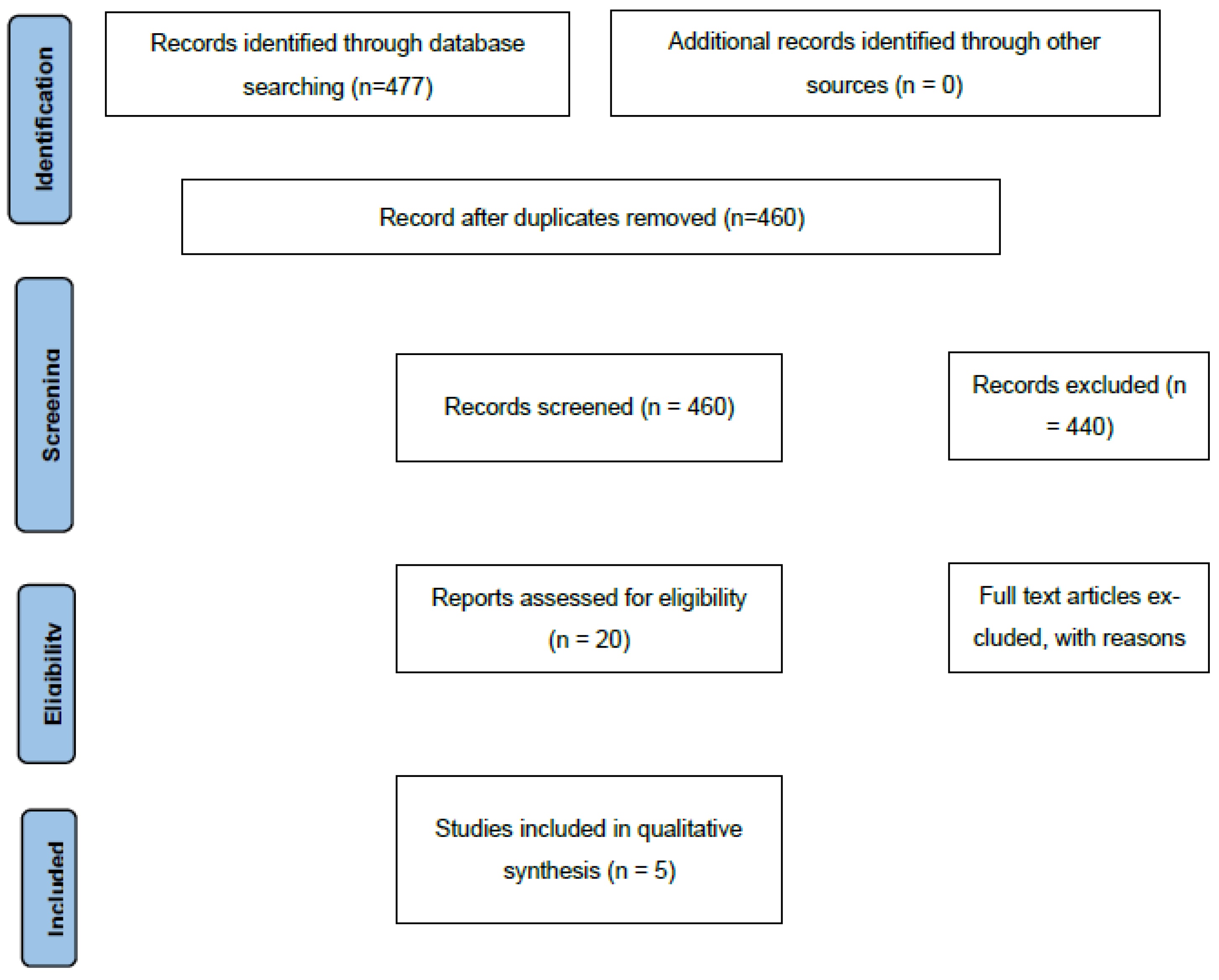 A total of 477 records were identified, with 17 duplicates removed. Following title and abstract screening, 440 records were excluded. Twenty publications underwent full-text review, and several were excluded for not meeting eligibility criteria. One publication with missing data on all three outcomes was excluded after an unsuccessful attempt to contact the corresponding author. In total, five studies were included in the qualitative and quantitative synthesis (