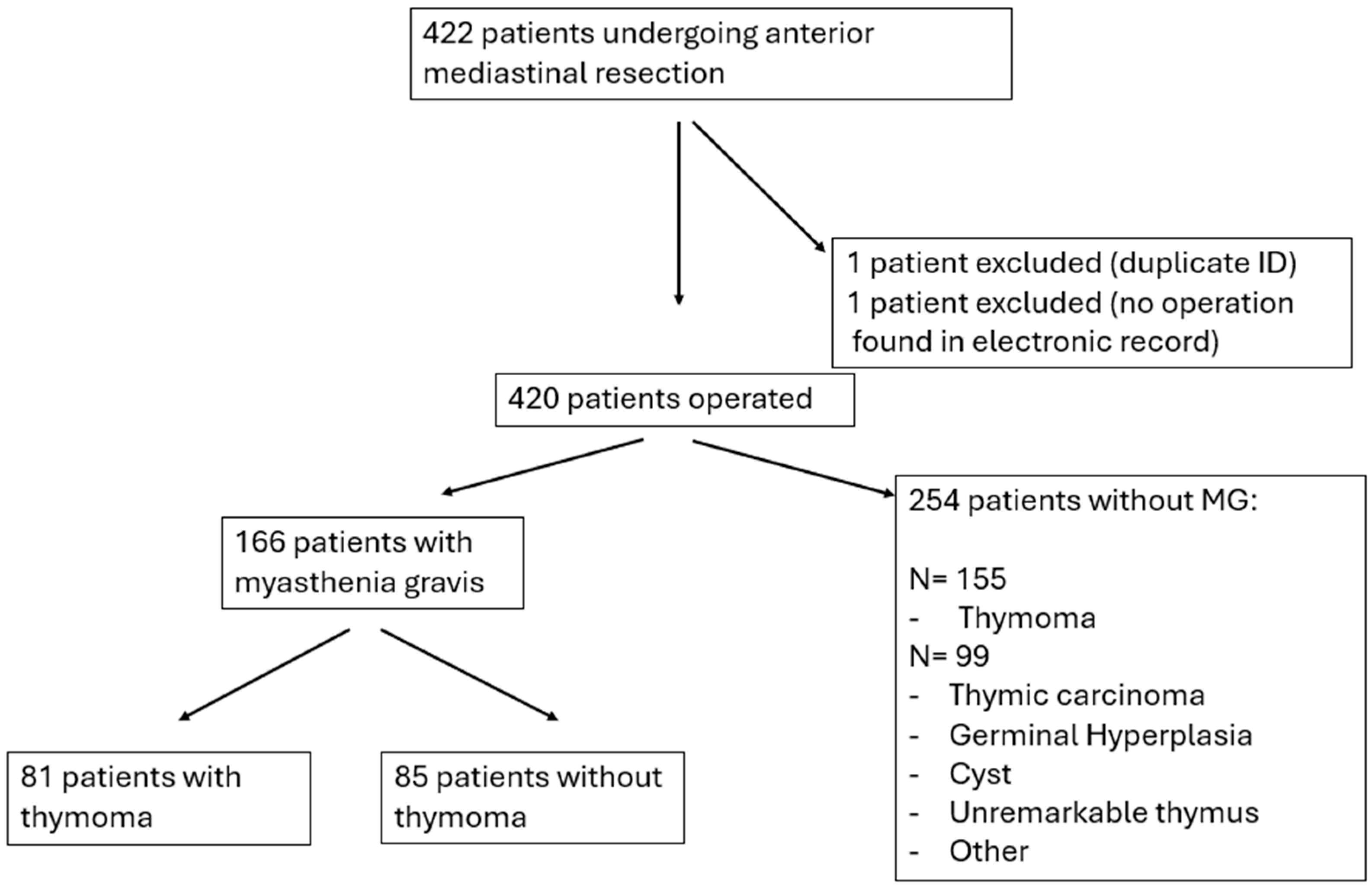 The following supporting information can be downloaded at: https://www.mdpi.com/article/10.3390/curroncol32120662/s1, Table S1—Distribution of thymic epithelial tumors (TETs) by WHO classification and myasthenia gravis (MG); Table S2—Distribution of thymic epithelial tumors (TETs) by Masaoka-Koga Stage classification and myasthenia gravis (MG); Table S3—Comparison of complete myasthenia gravis (MG) remission 6 months post-thymectomy between thymomatous and non-thymomatous MG; Table S4—Intraoperative and postoperative complication rates by surgical approach (open vs. minimally invasive) and length of stay.; Table S5—Distribution of myasthenia gravis (MG) antibody subtypes in thymomatous and non-thymomatous patients.