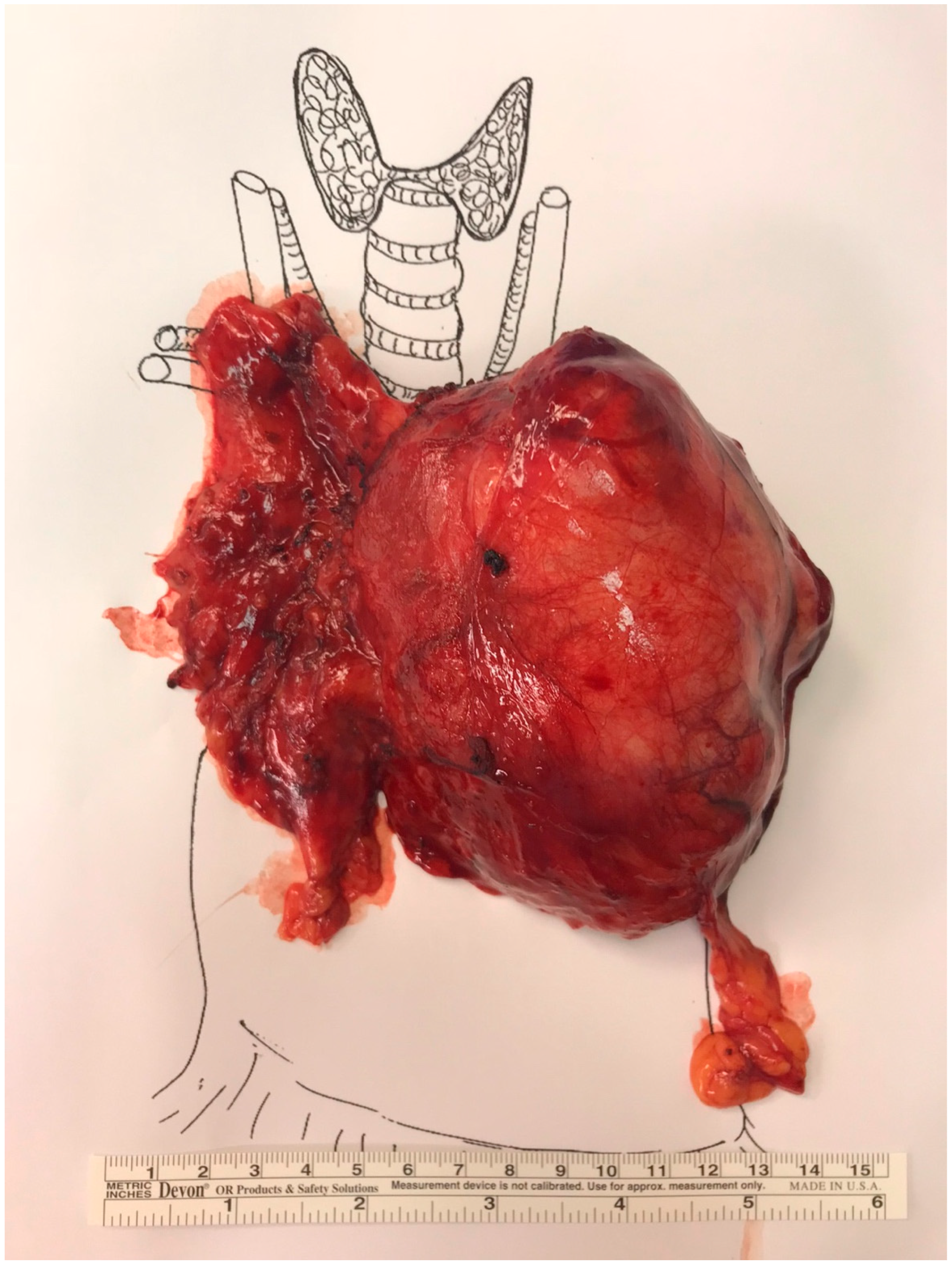 Figure 2. Total thymectomy and thymoma specimen oriented as per the International Thymic Malignancy Interest Group (ITMIG) surgical standards.