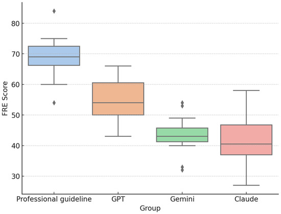 FRE distribution by source (Professional resources n = 14, ChatGPT n = 14, Gemini n = 14, Claude n = 14; total N = 56). Higher FRE values indicate easier readability.