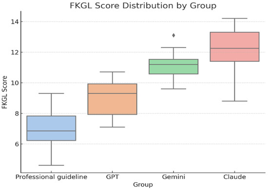 FKGL distribution by source (Professional resources n = 14, ChatGPT n = 14, Gemini n = 14, Claude n = 14; total N = 56). Higher FKGL values indicate greater reading difficulty.