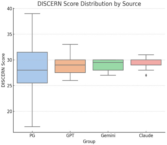 For the quality of online information, we used DISCERN scores, which were similar across all sources (n = 56; 14 responses per group): professional resources (M = 27.93, SD ≈ 5.1), ChatGPT (M = 29.00, SD ≈ 2.2), Gemini (M = 29.21, SD ≈ 1.7), and Claude (M = 29.07, SD ≈ 1.5) (Figure 4). A one-way ANOVA revealed no significant differences in DISCERN scores, F(3, 52) = 0.48, p = 0.70, η2 = 0.03, 95% CI [0.00–0.10], indicating a negligible effect size and suggesting that all sources performed comparably in terms of content quality (Table 6).