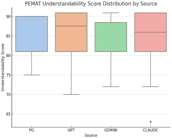 Regarding PEMAT-Understandability, scores were consistently high across all sources (n = 56; 14 responses per group): professional resources (M = 85.29, SD ≈ 5.96), ChatGPT (M = 85.18, SD ≈ 5.89), Gemini (M = 81.89, SD ≈ 6.91), and Claude (M = 84.02, SD ≈ 6.85) (Figure 5). A one-way ANOVA indicated no significant differences in understandability among the groups, F (3, 52) = 0.68, p = 0.57, η2 = 0.04, 95% CI [0.00–0.12], showing a negligible effect size and suggesting that all sources provided similarly understandable information (Table 7).