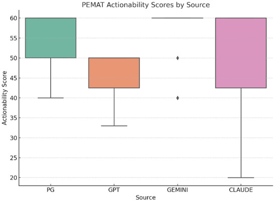 PEMAT-Actionability distribution by source (Professional resources n = 14, ChatGPT n = 14, Gemini n = 14, Claude n = 14; total N = 56). Higher PEMAT-Actionability scores indicate clearer guidance for patients on what actions to take.