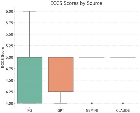 Empathy was assessed using the Empathic Communication Coding System (ECCS), with average scores closely aligned across sources (n = 56; 14 responses per group): professional resources (M = 4.64, SD ≈ 0.63), ChatGPT (M = 4.71, SD ≈ 0.47), Gemini (M = 4.79, SD ≈ 0.43), and Claude (M = 4.79, SD ≈ 0.43) (Figure 7). A one-way ANOVA revealed no significant differences in empathic communication among the groups, F(3, 52) = 0.27, p = 0.85, η2 = 0.02, 95% CI [0.00–0.09], indicating a negligible effect size and confirming that all sources conveyed empathy at comparable levels (Table 9).