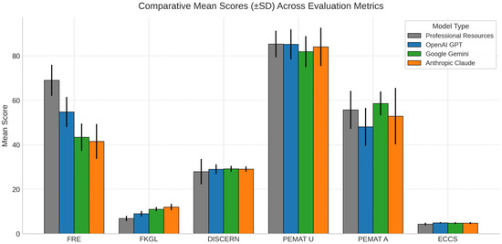 Comparison of mean scores and standard deviations across all metrics (Professional resources n = 14, ChatGPT n = 14, Gemini n = 14, Claude n = 14; total N = 56). Higher scores represent better readability, quality, understandability, actionability, or empathy, depending on the respective metric.