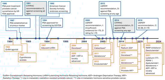 A 1987 study of PSA in patients with prostate cancer established its use as a tumor marker (Figure 1) [25]. The seminal paper describing the utility of PSA for screening was published in 1991, and it was approved for use in screening by the United States (US) Food and Drug Administration in 1994 [26]. The Canadian Task Force on Preventive Health Care (CTFPHC) recommended against PSA screening in 1991 and again in 2014, while Canadian specialty societies have continued to recommend screening for those in good health with a long life expectancy [27,28]. Screening was widely used in the United States until 2008, when the US Preventive Services Task Force (USPSTF) suggested that there was insufficient evidence for PSA screening in men younger than 75 and recommended against screening in men older than 75. In their draft recommendation in 2011, finalized in 2012, the USPSTF recommended against PSA screening in men of all ages [29]. However, in 2018, they issued a neutral recommendation for men aged 55–69 and continued to recommend against screening for men older than 70 [30]. Access to PSA screening in Canada remains variable, as it is publicly funded in some provinces if ordered by a primary care provider, while it is self-pay in Ontario, British Columbia and Quebec. Maintaining the benefits of PSA screening while mitigating potential harms has been an ongoing area of study in Canada. The use of Magnetic Resonance Imaging (MRI) as a secondary screening test reduces both the number of biopsies needed and improves the detection of higher-risk cancers [31,32,33].