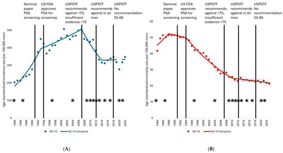 Among men aged 50–74, the prostate cancer age-standardized mortality rate (ASMR) increased by nearly 4% per year (p = 0.001) from 1984 to 1988, declined slightly but non-statistically significantly (p = 0.077) over the next several years, and then decreased from 1994 to 2010 at an annualized rate of −4.3% (p = 0.022) (Table 1, Supplemental Figure S1). A more gradual decrease of −1.0% per year (p = 0.023) up to 2023 has subsequently been observed. A 59% decline in the prostate cancer ASMR among men aged 50–74 was achieved from 1990, when the rate peaked at 51.5 per 100,000 men, to 2023, when a low of 21.3 per 100,000 men was recorded. A 50% decline was noted between 1990 and 2010 alone. Men aged 75 and older experienced an increasing ASMR (APC = 1.4, p < 0.001) up to 1995, when the rate peaked at 512.7 per 100,000 men. The ASMR subsequently declined by 46% from 1995 to 2023, first by −2.5% (p = 0.001) annually until 2012—a 37% drop over this period—and then by −1.6% annually until 2023 (p = 0.006, 15% decrease). Age-standardized trends relative to screening and treatment changes are shown in Figure 2A,B.