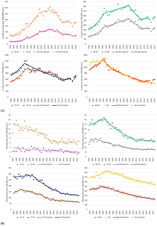 Declines in prostate cancer mortality rates among men aged 50 to 54 spanned the study period (APC = −1.6%, p = 0.001), while significant declines among those aged 55 to 59 were restricted to the period from 2002 to 2007 (APC = −8.3%, p = 0.028) (Table 2, Figure 3B). In older age groups, excepting those aged 75 to 79, mortality rates initially increased until the late 1980s or early 1990s, highlighted by a 4.9% annualized increase from 1984 to 1988 among men aged 70 to 74 (p = 0.010). Over this same five-year period, a 5.4% per year increase among men aged 60 to 64 approached statistical significance (p = 0.051). Mortality rates then declined by about 4% per year among men in the 60 to 64, 65 to 69, and 75 to 79 age groups until 2011 to 2013 (all p < 0.001). Mortality declines after this time in these age groups flattened out and were non-significant. Reductions of about 60% were achieved in each of these age groups from the initiation of the respective downwards trends to 2023, with over 90% of the mortality reduction occurring during the period of significant change. Among men aged 70–74, the prostate cancer mortality rate has been significantly decreasing since 1988, with the largest decrease occurring between 2009 and 2014 (APC = −6.7, p = 0.009). Over the 35-year period, a 63% reduction in the mortality rate was achieved in this age group. Among men aged 80 and older, mortality rates have continued to decline by 2–3% per year for close to three decades (both p < 0.001). As a result, these rates have been reduced by 54% since 1992 among men aged 80–84, and by 36% since 1995 among men aged 85 and older.