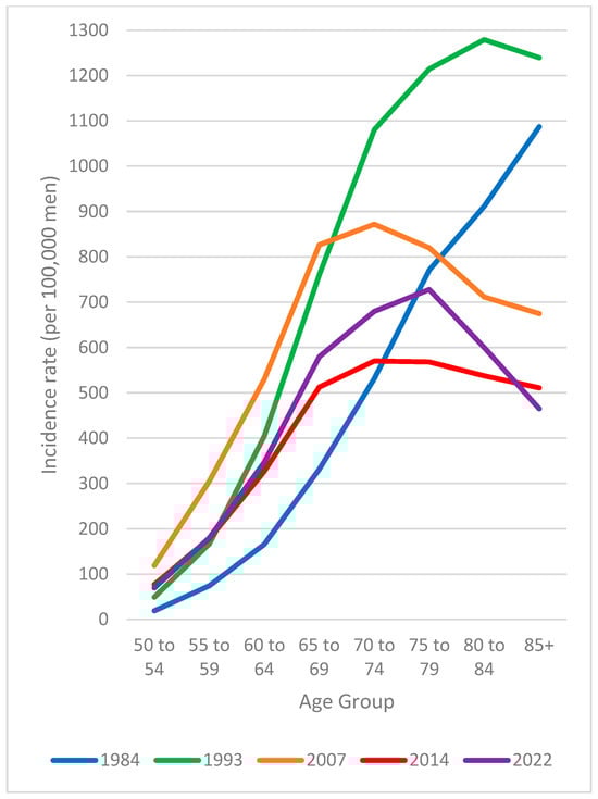 The pattern of prostate cancer incidence by age seen in 1984 could reflect a baseline for symptomatic presentation of clinically relevant cases, given there was no screening at this time. The natural history of prostate cancer is such that early-stage prostate cancers may develop into metastatic disease over a 10- to 15-year period [74]. The large burden of cases in older men in 1984 aligns with this natural history, suggesting increasing presentation of clinically significant prostate cancer with advancing age. The changing curve of incidence rate by age after 1984 likely reflects the impacts of screening on diagnosis, with a shift to diagnosis at an earlier age and a significant drop in cases in older men.