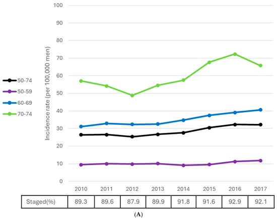 Concerns regarding the utility of PSA testing are primarily related to overdiagnosis and subsequent overtreatment. These are important concepts, as treatment side effects, such as incontinence and erectile dysfunction, can have profound impacts on quality of life. Overdiagnosis rates vary widely depending on age, Gleason score, and PSA, in one model ranging from 2.9 to 88.1% [77]. Although the drop in stage I cases suggests some overdiagnosis was likely ongoing, the different timing of peak incidence in men older and younger than 70 in this study suggests the “harvest” effect did not occur in older men, where overdiagnosis is more relevant. The continuous decline in incidence in men older than 70 after screening suggests that the ongoing diagnosis of prostate cancer in younger men may have found clinically relevant cases that did not then present symptomatically in those older than 70. The recent increase in incidence in men in their early eighties suggests this trend may be reversing, given a known PSA screening-related lead time of 5.5 to 6.3 years for white men and 7.7 years for black men [24,78]. It is important to note that although survival can be impacted by lead time bias, mortality is not. The joinpoint interval with the greatest mortality reduction (2002–2007, APC = −8.3) was observed among men aged 55–59. This suggests a strong benefit of screening and treatment advances in this group of younger men with potentially biologically aggressive disease for whom overdiagnosis is less relevant. Finally, mortality rates consistently declined after the onset of screening. However, despite multiple treatment advances, the pace of age-specific declines either diminished or leveled out after screening was no longer recommended. At the same time, the rate of diagnosis of stage IV prostate cancer increased. Together, this suggests that earlier detection with PSA was finding cases before they were metastatic, where treatment was potentially curative.