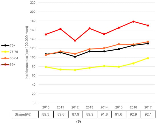 Statistically significant decreases in prostate cancer incidence rates for stages I–III combined from 2010 to 2017 were observed among men aged 50–59 (APC = −5.8, p = 0.032) and those aged 85+ (APC = −2.7, p = 0.033) (Table 3). However, all age-specific APCs were negative, decreasing in absolute value with increasing age through the 80–84 age group. Over the same period, the ASIR for stage IV prostate cancer for men aged 50–74 increased at an annualized rate of 3.7% (p = 0.010); among men aged 75 and older, the increase was 3.1% per year (p < 0.001) (Table 3, Figure 5A,B). Increases in stage IV incidence rates were also observed for each 10-year age group, ranging from an annualized increase of 2.6% among men aged 50–59 (p = 0.022) to 4.1% among men aged 60–69 (p < 0.001). The incidence rate of unknown stage cases decreased in every age group from 2010 to 2017 (all p < 0.001). Though not directly comparable with the data presented for 2010 to 2017, stage IV rates for 2018 to 2021 were higher except in 2020 (Figure 6A,B).