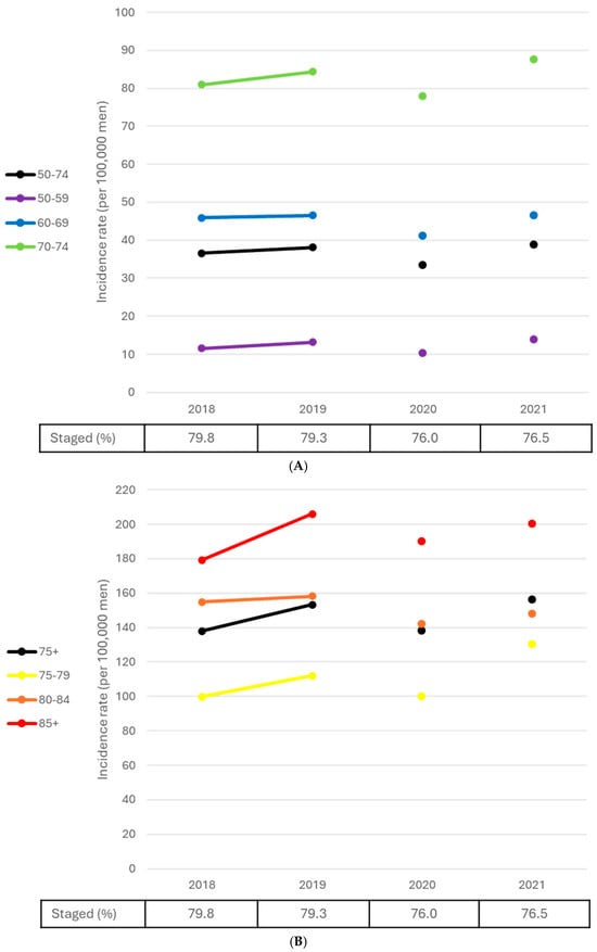 (A) Stage IV prostate cancer age-standardized and age-specific rates, males, ages 50–74, Canada excluding Quebec, 2018 to 2021. (B) Stage IV prostate cancer age-standardized and age-specific rates, males, ages 75 and older, Canada excluding Quebec, 2018 to 2021. Notes: The 2020 incidence data point is not connected to adjoining data points because the incidence data from this year were considered anomalous, arising from the COVID-19 pandemic. The percentage staged refers to the percentage of total cases assigned stage I–IV exclusively. Quebec was excluded because cases diagnosed in this province from 2018 onward had not been submitted to the Canadian Cancer Registry (CCR). Cases diagnosed in Nova Scotia for 2020 onward were similarly unavailable. Cases diagnosed in Saskatchewan in 2018, Nova Scotia in 2019, and Newfoundland and Labrador in 2021 were excluded because they lacked staging information. Age-standardized rates (50–74 and 75+) were calculated using the 2021 Canadian Standard Population. Prostate cancer cases were staged using the American Joint Committee on Cancer 8th Edition. Source: Canadian Cancer Registry (1992–2022) at Statistics Canada.