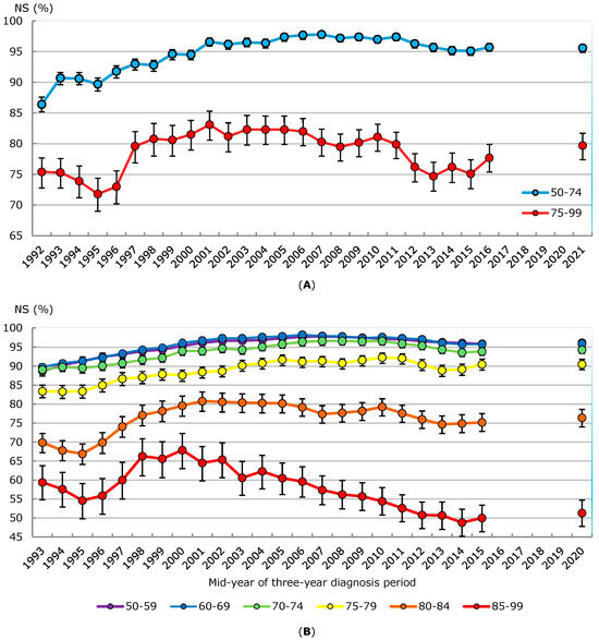 Prostate cancer five-year net survival among men aged 50–74 generally increased from the early 1990s to the mid-2000s, increasing from a low of 86.4% (95% CI: 85.2–87.6%) in 1992 to a peak of 97.8% (97.2–98.3%) in 2007 (Figure 7A, Supplementary Table S1). After a plateau of several years, net survival declined from 97.4% (96.8–97.9%) in 2011 to 95.1% (94.4–95.7%) in 2015. The predicted five-year net survival estimate for cases diagnosed in 2021 was 95.6% (94.9–96.1%). Among men diagnosed with prostate cancer aged from 75 to 99, five-year net survival increased from 71.8% (69.0–74.4%) in 1995 to a peak of 83.1% (80.6–85.3%) in 2001. Net survival remained above 80% through the 2000s but then declined from 81.1% (78.8–83.2%) in 2010 to 75.1% (72.7–77.4%) in 2015. The predicted net survival estimate for 2021 of 79.7% (77.4–81.7%) was higher than the estimate for 2015 (p = 0.005).