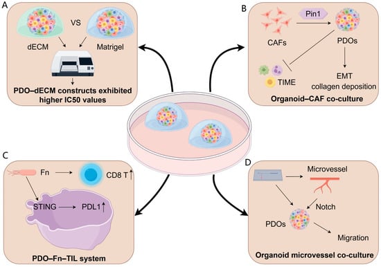 Reconstructing the tumor microenvironment in organoids. (A) ECM-derived models: Patient-derived decellularized extracellular matrix (dECM) scaffolds preserve tumor-specific biochemical and mechanical cues, resulting in PDO–dECM constructs that display higher IC50 values than Matrigel-grown PDOs, indicating ECM-mediated treatment tolerance. (B) Organoid–CAF co-culture: Cancer-associated fibroblasts (CAFs) remodel the TME through Pin1-dependent activation, promoting EMT programs, collagen deposition, and broader immunosuppressive TIME modulation, collectively enhancing PDO invasiveness and treatment resistance. (C) PDO–Fn–TIL immune system: Co-culture with Fusobacterium nucleatum (Fn) stimulates STING signaling and upregulates PD-L1 expression in PDOs, accompanied by elevated CD8+ T-cell responses, modeling microbe-driven immune modulation. (D) Organoid microvessel co-culture: Endothelialized microvessel-on-chip platforms support direct interactions between PDOs and perfusable vascular structures, enabling Notch-mediated migration and providing a physiologically relevant niche to study vascular–tumor crosstalk.