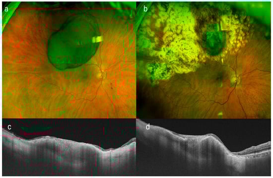 Multimodal imaging of a patient with superotemporal uveal melanoma treated by endoresection with residual tumor margins. (a) Color fundus photograph prior to surgical intervention, showing the pigmented choroidal lesion. (b) Postoperative fundus image following endoresection, revealing the surgical bed with visible residual tumor at the margins. (c,d) Swept-source optical coherence tomography (SS-OCT) scans in transverse and longitudinal planes, respectively, highlighting the residual tumor tissue at the scleral bed. Note the small remaining tumor in both sections.