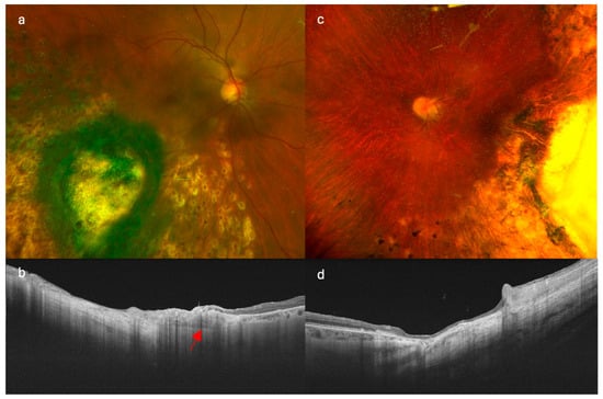 Comparison of imaging findings in patients treated with different endoresection techniques. (a,b) show retinography and swept-source optical coherence tomography (SS-OCT), respectively, in a patient treated with modified endoresection preserving residual tumor margins with adjuvant brachytherapy. (c,d) correspond to a patient treated with conventional complete endoresection with adjuvant brachytherapy. Note the preserved choroidal tissue at the tumor margins in image (b) (red arrow), particularly in the posterior region, which contrasts with the complete resection observed in (d).