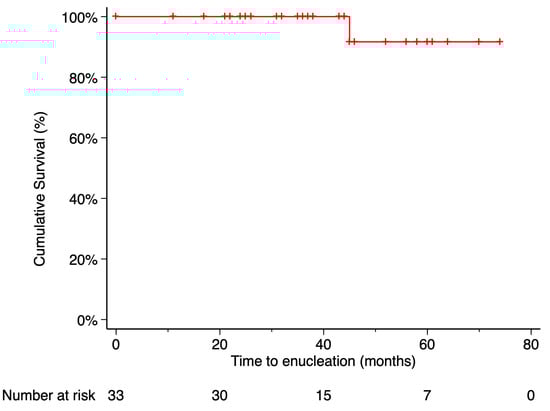Kaplan–Meier curve of enucleation-free survival. Enucleation-free survival was defined as the time from treatment initiation to enucleation, with patients who did not require enucleation censored at their last follow-up visit. Tick marks indicate censored data. The number of patients at risk at each time point is shown below the plot.