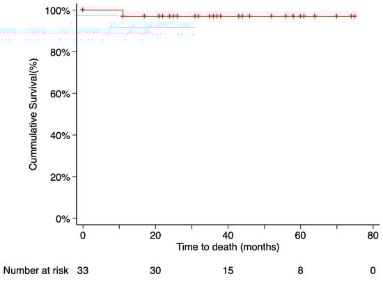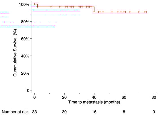 Metastasis occurred in 2 patients (6.06%), with the liver being the site of involvement in both cases. The Kaplan–Meier estimated metastasis-free survival rate at 5 years post-treatment was 90.91%. Time from endoresection to metastasis was 2 months in one case and 40 months in the other. Only the death of the first patient was recorded during the follow-up period. The time from metastasis diagnosis to death was 9 months. According to Kaplan–Meier analysis, the estimated 5-year overall survival was 97% (Figure 5 and Figure 6).
