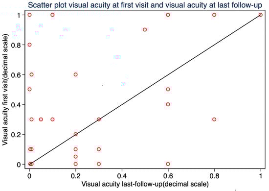 Scatter plot of visual acuity (decimal scale) at baseline versus final follow-up.