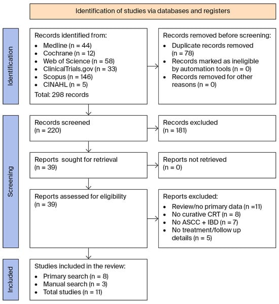 Our search identified 298 articles, of which 220 were screened, leaving 39 articles for full review. After a thorough review, 31 articles were excluded, namely, 11 review articles that lacked primary patient data, 8 articles that did not treat patients with curative CRT, 7 articles that did not include patients with co-occurring ASCC and IBD, and 5 articles that lacked treatment or follow-up details. Eight publications met the eligibility criteria. A manual review of the complete reference lists from the 8 eligible articles and 11 review articles identified 3 additional publications that met the eligibility criteria and 1 review article without primary patient data. The complete reference lists of these articles were also reviewed, identifying no new publications of interest. Table 1 shows the eleven publications, comprising 24 patients from seven case reports and four retrospective chart reviews that were included in the final systematic review [34,35,36,37,38,39,40,41,42,43,44].