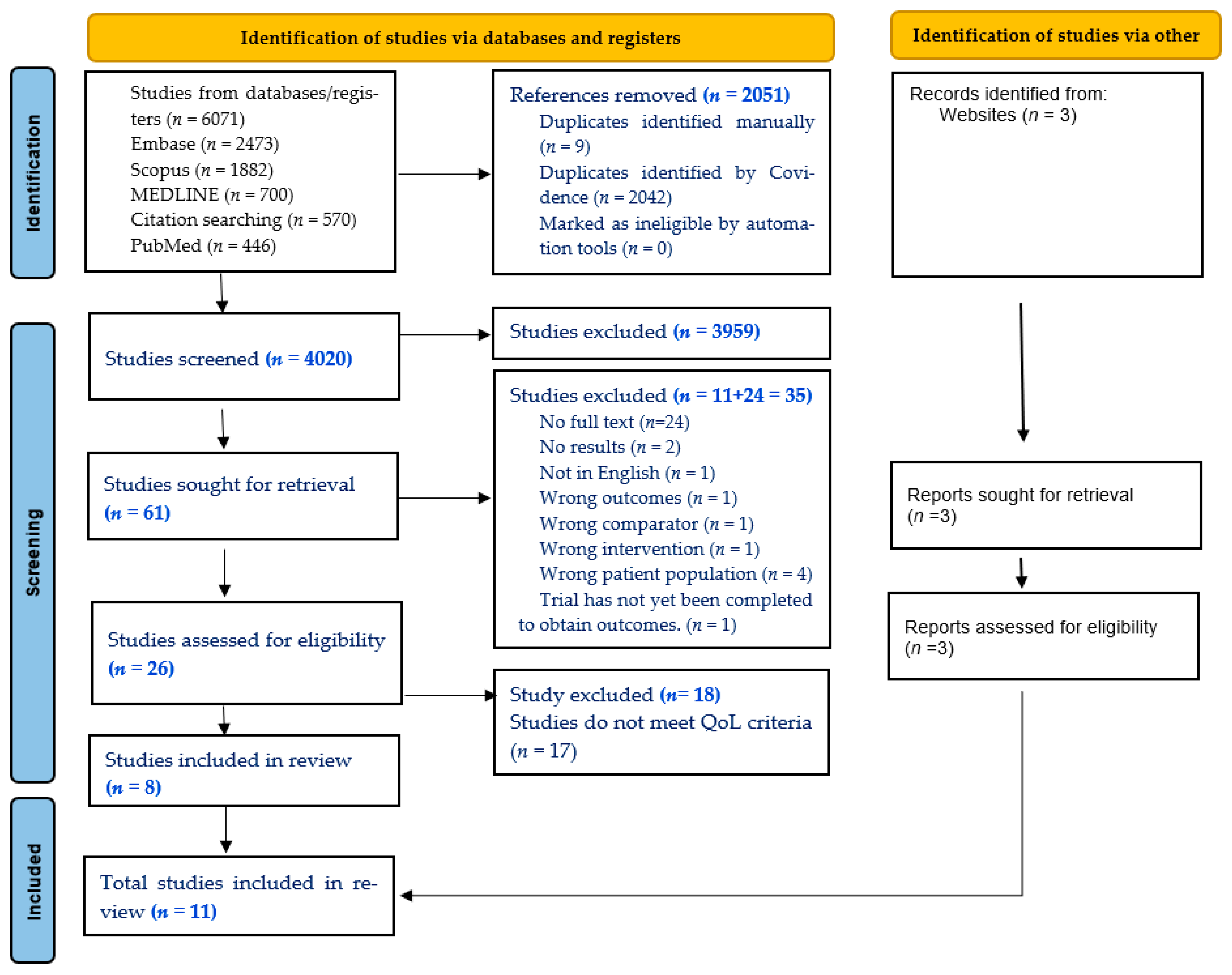 | Outcomes | Reporting on quality of life (physical well-being, emotional well-being, social well-being and functional well-being). Reporting on patient-reported outcomes (symptoms, side effects, emotional well-being, satisfaction with care). | Studies that do not report relevant outcomes related to MDT or QoL or Patient reported measures. |