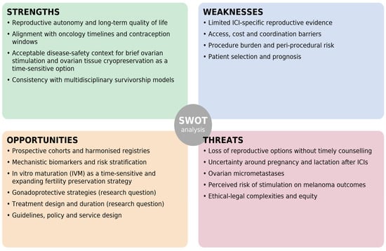 Raimondo, D.; Miscia, M.; Raffone, A.; Maletta, M.; Cipriani, L.; Marchese, P.V.; Comito, F.; Vicenti, R.; Cortese, F.; Pazzaglia, E.; et al. Should Fertility Preservation Be Offered to Young Women with Melanoma Receiving Immune Checkpoint Inhibitors? A SWOT Analysis. Curr. Oncol. 2025, 32, 702. https://doi.org/10.3390/curroncol32120702