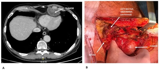 (A) Preoperative CT scan showing a chondrosarcoma arising from the 6th costo-chondral junction and compressing the cardiac surface. Radiological features suggesting chondrosarcoma: lobulated, expansive bone lesion with well-defined margins; internal low attenuation due to high water content of the cartilaginous matrix; soft tissue extension beyond the bone. (B) Intraoperative view demonstrating surgical resection of the chondrosarcoma.