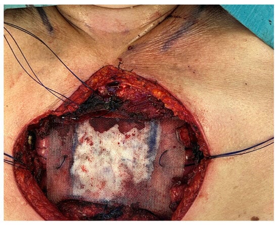- Velotta, J.B.; Hammer, J.; Mukhatyar, V. Chest Wall Reconstruction Using Biologic Mesh to Cover Soft Tissue Defects: A Narrative Review. J. Surg. Res. 2025, 311, 98–105. [Google Scholar] [CrossRef]