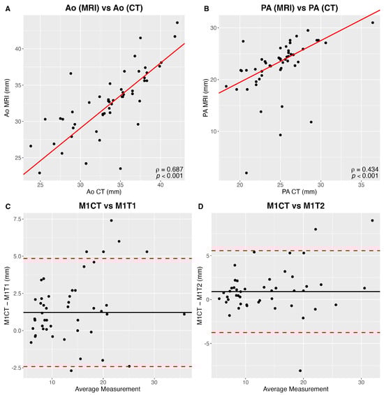 (A) Correlation between aortic (Ao) CT and MR measurements. (B) Correlation between pulmonary artery (PA) CT and MR measurements. (C) Reader 1 (M1) Bland and Altman comparison CT and MR T1-weighted nodule largest axial diameters. (D) Reader 1 (M1) Bland and Altman comparison between CT and MR T2-weighted nodule largest axial diameters.