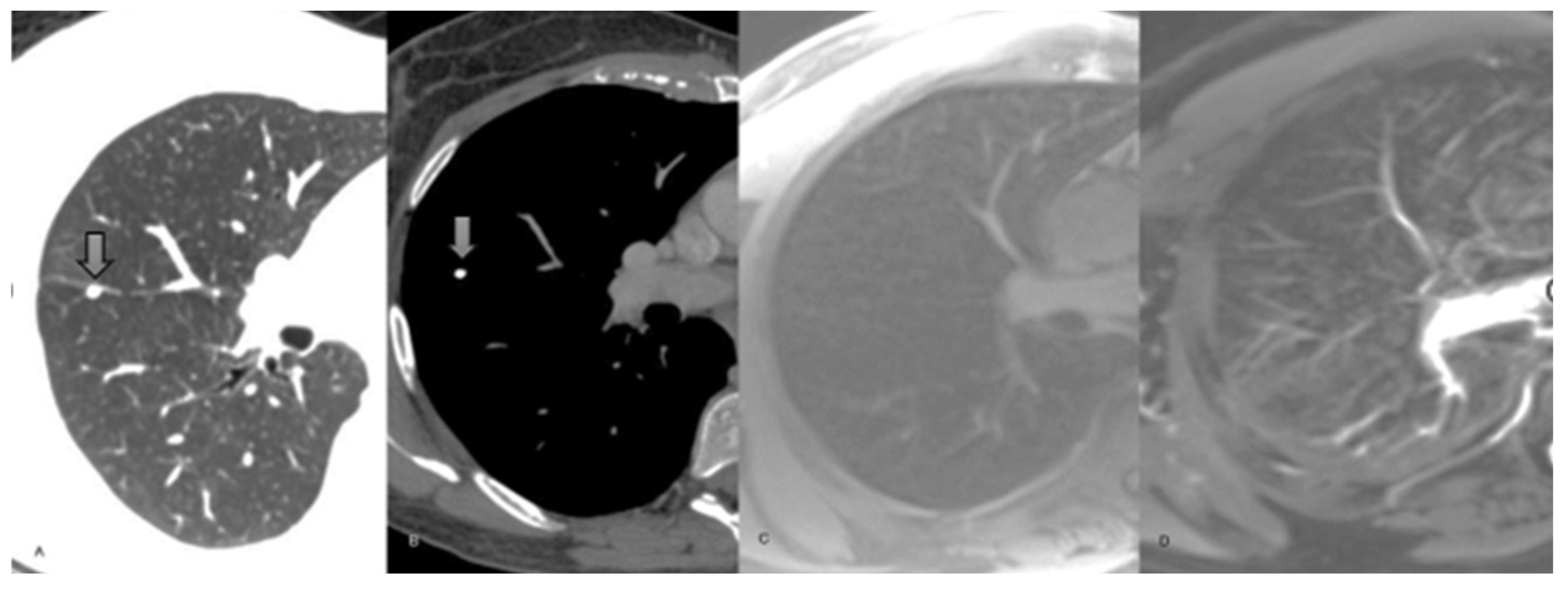 - Periaswamy, G.; Arunachalam, V.K.; Varatharajaperumal, R.; Kalyan, G.; Selvaraj, R.; Mehta, P.; Cherian, M. Comparison of Ultrashort TE Lung MRI and HRCT Lungs for Detection of Pulmonary Nodules in Oncology Patients. Indian J. Radiol. Imaging 2022, 32, 497–504. [Google Scholar] [CrossRef]