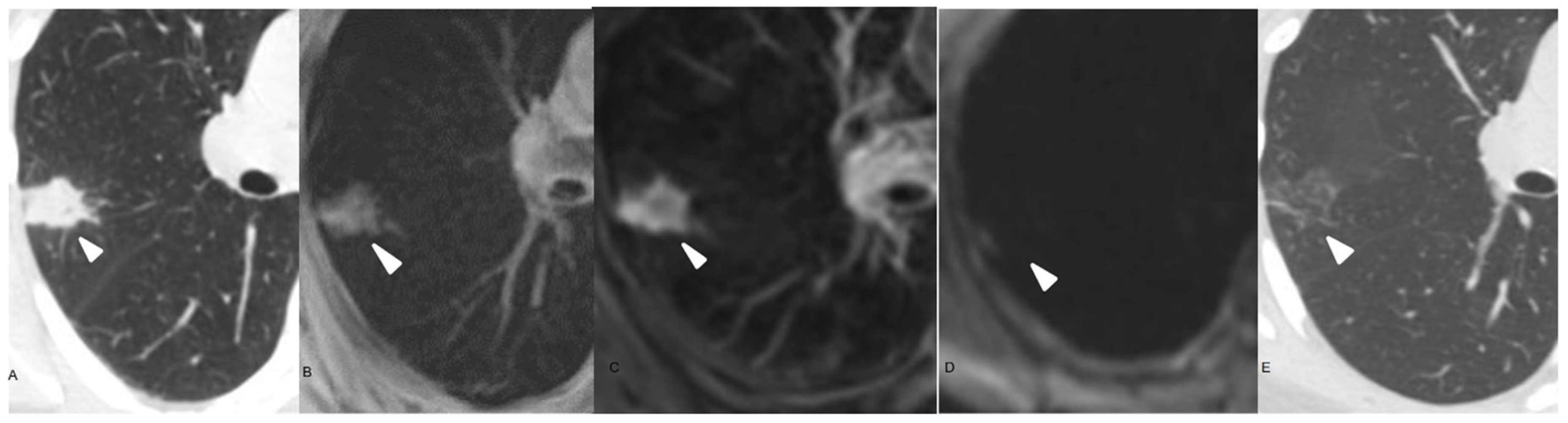 - Sanchez, F.; Tyrrell, P.N.; Cheung, P.; Heyn, C.; Graham, S.; Poon, I.; Ung, Y.; Louie, A.; Tsao, M.; Oikonomou, A. Detection of solid and subsolid pulmonary nodules with lung MRI: Performance of UTE, T1 gradient-echo, and single-shot T2 fast spin echo. Cancer Imaging 2023, 23, 17. [Google Scholar] [CrossRef]