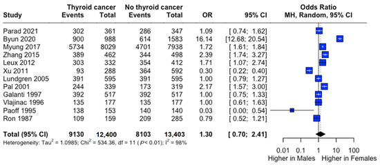 Sex-specific risk of thyroid cancer. Forest plot comparing thyroid cancer risk between males and females. Odds ratio (OR) and 95% confidence intervals are shown. Central diamonds represent pooled estimates; horizontal lines indicate 95% confidence intervals [22,23,24,25,26,27,29,30,31,32,33,34].