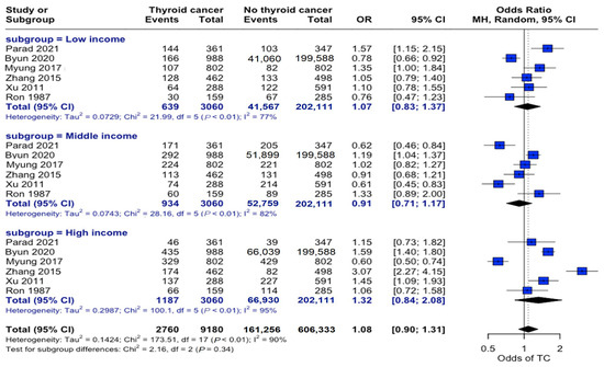 Income-stratified risk analysis. Forest plot showing odds ratios for thyroid cancer risk across three income categories. Horizontal lines represent odds ratios (ORs) and 95% confidence intervals (CIs). Categorizing individuals by income level did not demonstrate a significant relationship between socioeconomic status and thyroid cancer risk [22,23,24,25,27,34].