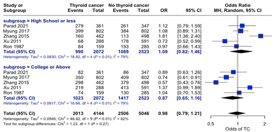 Examining education levels in thyroid cancer showed no significant overall association between education level and thyroid cancer risk (OR = 0.98, 95% CI: 0.79–1.21). When individuals were grouped by “High School or Less” and “College or Above” education levels, there were no significant differences in the odds of developing thyroid cancer across the strata (Figure 5).