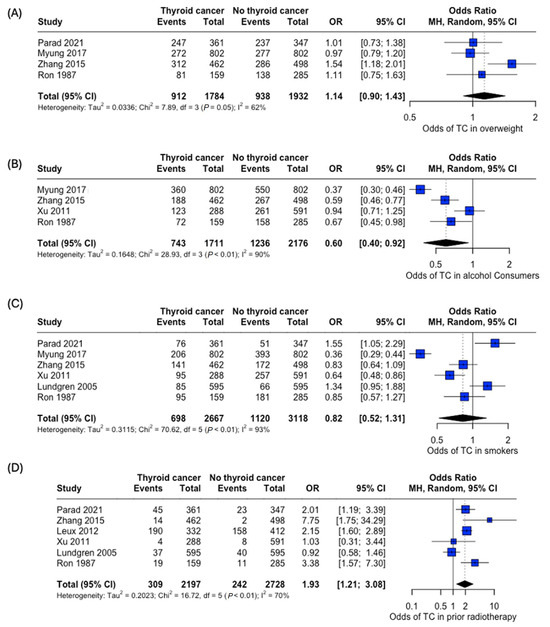 Odds of developing thyroid cancer based on lifestyle factors and comorbidities. Odds of thyroid cancer in (A) Overweight, (B) Alcohol consumers, (C) Smokers, and (D) Patients with prior radiotherapy [22,24,25,26,27,29,34].
