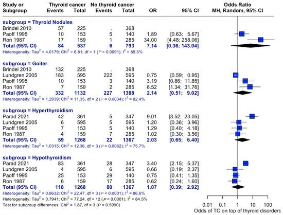 Thyroid-Related Disorders and Cancer Risk. Forest plot showing associations between pre-existing thyroid conditions and subsequent cancer risk—analysis stratified by condition type [22,28,29,33,34].