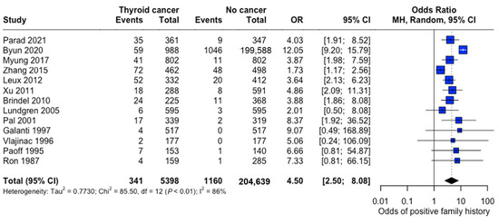 Overall Family History Association. Forest plot showing pooled and study-specific odds ratios for thyroid cancer risk associated with positive family history. A random-effects model was used due to significant heterogeneity (I2 > 50%) [22,23,24,25,26,27,28,29,30,31,32,33,34].