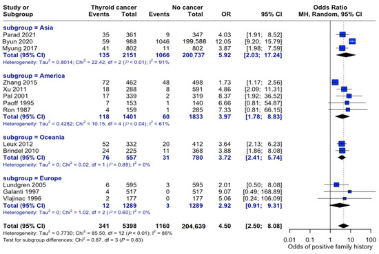 The association between family history and thyroid cancer risk varied across different geographic regions. Studies originating in Asia consisted of study populations that were nearly six times more likely to develop thyroid cancer if a family history of thyroid cancer was present (OR: 5.92, 95% CI: 2.03–17.24). Studies conducted in Europe showed the weakest association between these variables (OR: 2.92, 95% CI: 0.91–9.31), although patients were still roughly three times more likely to develop thyroid cancer if they had a family member diagnosed with thyroid cancer. The test for subgroup differences by continent was not statistically significant; however, overall heterogeneity in the meta--analysis was high (I2 = 83%), indicating that true effect sizes likely vary across studies. Thus, geographic variation could not be statistically confirmed by this subgroup analysis, which may have been underpowered to detect modest regional differences or other unmeasured sources of variability (Figure 10).