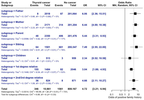 The risk of thyroid cancer varies based on the degree of relatedness in family history. If the relative was previously diagnosed with thyroid cancer, the odds of an individual developing thyroid cancer were 6 times greater than those without a family history (OR = 6.06, 95% CI = 2.37–15.51). A family history due to a child’s diagnosis resulted in the lowest familial odds of developing thyroid cancer, OR = 2.34 (95% CI = 0.52–10.58), while family history through siblings with prior thyroid cancer diagnosis had the greatest association (OR = 7.49, 95% CI = 2.55–22.0), as seen in Figure 11. The test for subgroup differences was not statistically significant, suggesting that the observed differences in risk by degree of relatedness may not be statistically meaningful.