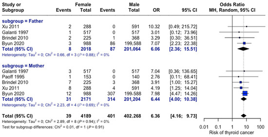 As depicted in Figure 12, maternal versus paternal history showed comparable risks. The odds of thyroid cancer were six-fold in patients with a positive family history attributable to the mother (OR = 6.44, 95% CI: 4.0–10.38) and the father (OR = 6.06, 95% CI: 2.37–15.51). No significant difference was observed between parental effects.