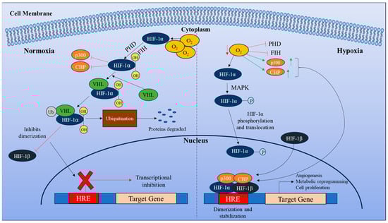 Differential regulation of HIF-1α signaling in normoxic and hypoxic conditions. Under normoxic conditions, HIF-1α undergoes hydroxylation by two oxygen-dependent enzymes, prolyl hydroxylases (PHDs) and factor-inhibiting HIF (FIH). PHDs facilitate the binding of von Hippel-Lindau (VHL), an E3 ubiquitin ligase, which ubiquitinates HIF-1α, leading to its proteasomal degradation. FIH inhibits the transcriptional activity of HIF-1α by preventing the recruitment of transcriptional coactivators, CREB-binding protein (CBP), and p300. In hypoxic conditions, HIF-1α is phosphorylated by mitogen-activated protein kinase (MAPK), which increases its stability. It is further translocated to the nucleus, where it dimerizes with HIF-1β to form a heterodimer. This complex, along with the recruitment of CBP/p300, enhances the transcription of HIF target genes. The HIF-1α/HIF-1β/CBP/p300 complex binds to the hypoxia-responsive element (HRE) of target genes, promoting angiogenesis, cell proliferation, and metabolic reprogramming.