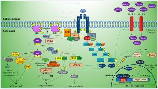 HIF-1α is generally stabilized under hypoxic conditions, but a study on cultured skeletal muscle cells showed that HIF-1α was stabilized by insulin treatment even in normoxic conditions. Both hypoxia and insulin signaling can activate the PI3K/Akt pathway, which may stabilize HIF-1α by controlling its protein translation [65]. The PI3K/Akt pathway regulates cell growth and survival, with Akt playing a major role in regulating insulin-mediated responses like the transport of glucose, gluconeogenesis, and glycogen synthesis [66]. PTEN, a tumor suppressor gene, negatively regulates the PI3K/Akt pathway and inhibits angiogenesis.