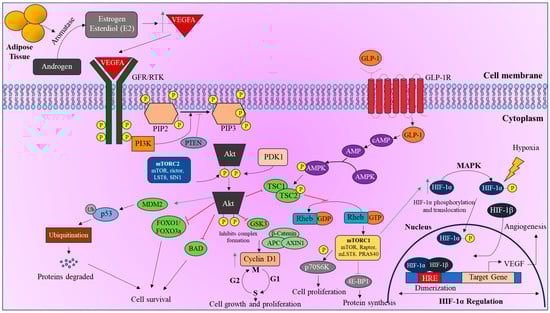 Role of PI3K/Akt/mTOR pathway in hormone-induced HIF-1α regulation. Adipose tissue releases aromatase, converting androgens to estrogen and estradiol (E2), which activates the PI3K/Akt/mTOR pathway, regulating HIF-1α by inducing VEGFA. VEGFA binds to RTK or GFR, initiating a cascade that recruits PI3K, converting PIP2 to PIP3, activating Akt. Activated Akt inhibits cell death signals, promotes cell proliferation, and supports mTOR signaling. The mTORC1 complex upregulates HIF-1α, stabilizing it even without hypoxia, leading to VEGF transcription for angiogenesis. Additionally, GLP-1 used in T2DM treatment upregulates HIF-1α via cAMP-mediated mTOR pathway induction.