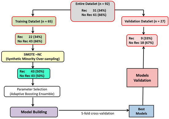 Before model development, the dataset was randomly split into a training set (70%, n = 65) and a validation set (30%, n = 27), using a stratified splitting procedure to preserve the class distribution (recurrence/no recurrence) across sets.