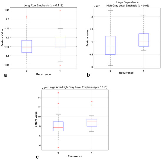 Boxplots of the most relevant radiomic features for predicting the recurrence and the corresponding p-value obtained from the Mann–Whitney U test: Long Run Emphasis (a), Large Dependence High Gray Level Emphasis (b), Large Area High Gray Level Emphasis (c).
