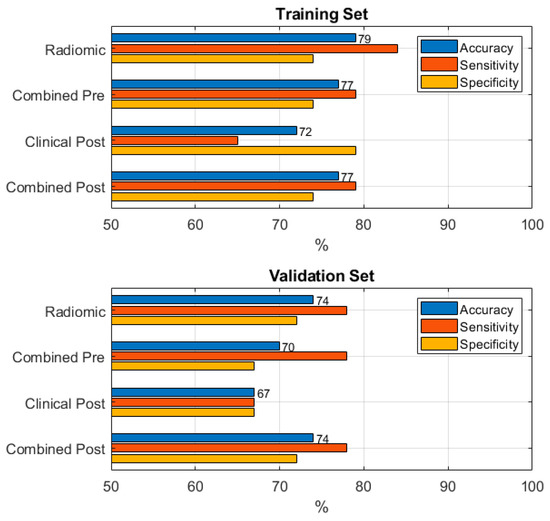 The combined post-treatment model, trained with an ensemble of Decision Trees, reached a good accuracy of 0.77 (95% CI: 0.66–0.85) and 0.74 (95% CI: 0.54–0.89) on the training set and the validation set, respectively. As assessed by McNemar’s test, no statistically significant differences in the performance among all of the proposed models were observed on either dataset (see Supplementary Table S2).